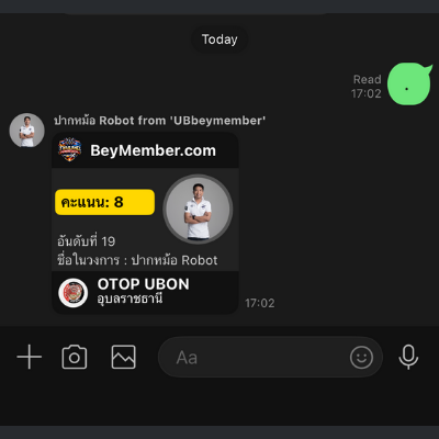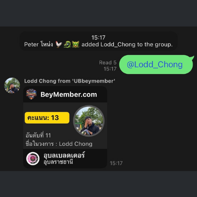 ให้ทัก Chat LINE TCL ให้พิมพ์ข้อความ . และกดส่งตามรูป ระบบจะส่ง Score Card ให้กับท่าน โดย Score Card จะแจ้งคะแนน ชื่อในวงการ สังกัดเบรดเดอร์ให้ท่านทราบ หากท่านเป็นผู้ใช้งานเริ่มแรก ท่านจำเป็นต้องกด "เชื่อมระบบ" ที่ Score Card และเข้าไปกดลงทะเบียนผ่าน ThaiBey.com ก่อนตามรูป